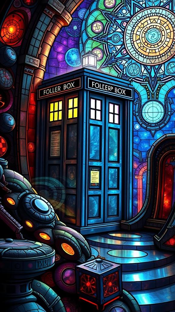 A hyper-detailed stained glass depiction of the TARDIS from Dr. Who, surrounded by the timeless landscape of Gallifrey. Intricate designs weave through the scene, capturing the essence of time and space with sparkling reflections. The rich hues of the stained glass cast vivid patterns, alive with swirling nebulas and celestial symbols. The scene emits a soft, ethereal glow, resonating with the mysterious allure of Gallifreyan architecture, blending futuristic elements with ancient motifs.