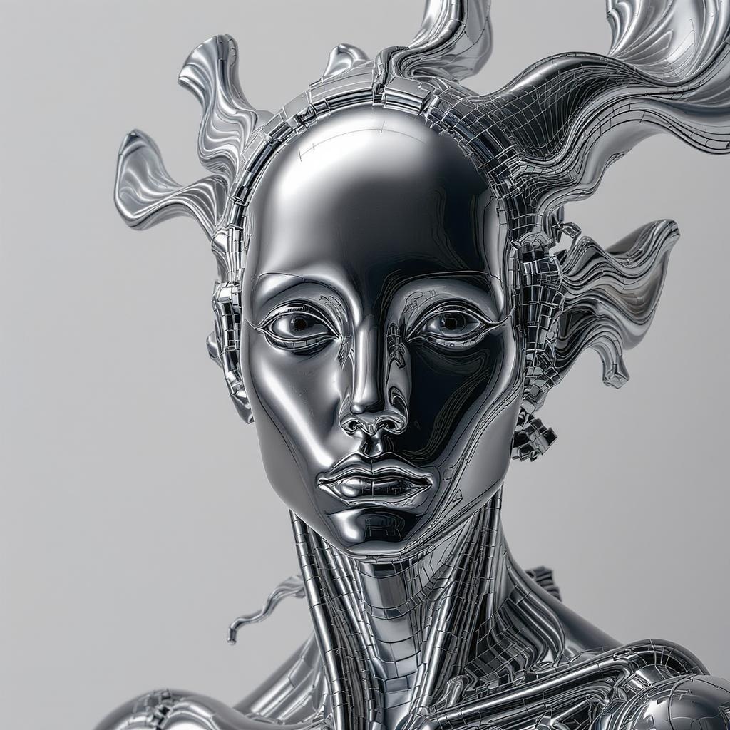 A hyper-detailed UHD image of a humanoid face crafted from gleaming, reflective metal, seamlessly blending into an abstract array of warped and curved forms. The surface exhibits a cold, chrome-like finish, evoking a fusion of organic intricacy and mechanical precision. Monochromatic in scheme, the design emphasizes the interplay of light and shadow across its contours, capturing the essence of both human and machine elements.