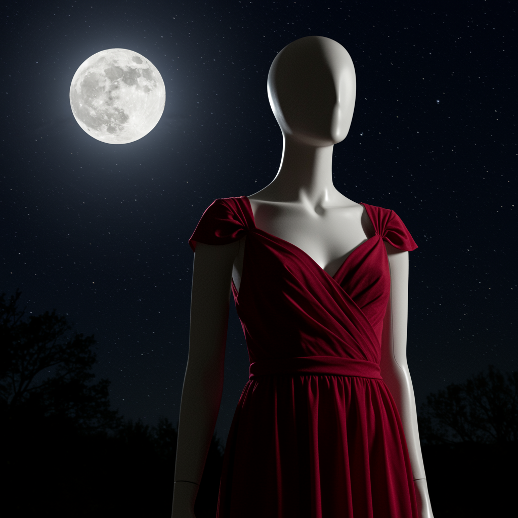 A hyper detailed ultra realistic 8k portrait of a mannequin in an elegant crimson gown, standing under the light of a full moon on a clear, starlit night; subtle shadows accentuate the mannequin's features, creating an ethereal and mysterious atmosphere, while a gentle breeze slightly ruffles the fabric of the dress, reflecting the moonlight with a delicate sheen.
