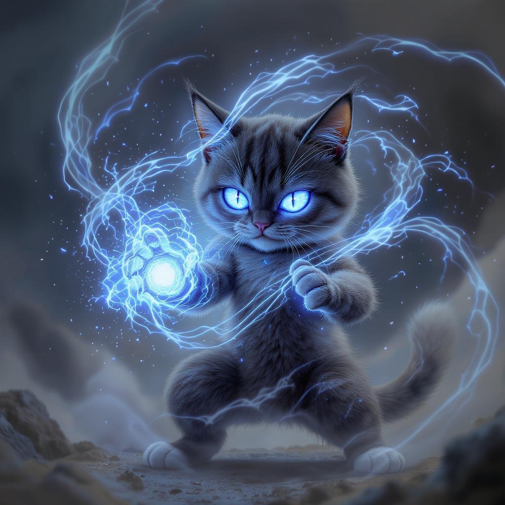 A hyper-detailed, ultrawide movie still of an anthropomorphic cute cat with Sharingan eyes, standing in a dynamic fighting pose. Its hands are clasped together, emitting a radiant blue light while chakra emanates from its body. The cat is surrounded by a swirling blue aura, exuding an intense and powerful energy, its fur slightly rippling under the force of its own power. The scene captures a sense of high-stakes intensity and mythical prowess, with every detail meticulously rendered to evoke a sense of both cuteness and formidable strength.