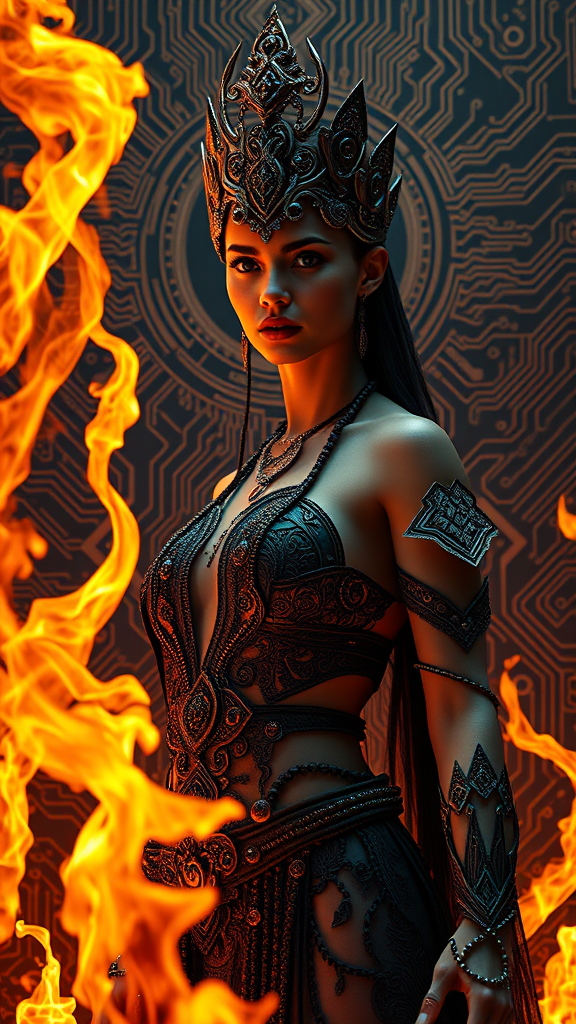 A hyper-maximalist cinematic portrayal of a young, exquisitely beautiful woman portraying the Queen of the Fire, standing regally amidst spiraling tongues of flame. Her intricate, tribal-inspired attire exudes a mix of elegance and power, perfectly complementing her flawless face and graceful stance. Set against a dynamic backdrop, the scene is intensified by complex patterns reminiscent of circuit boards, adding a futuristic element to this dark fantasy narrative. The composition emphasizes realism and intensity, with dramatic shadows and vibrant lighting creating a sense of drama and grandeur. Captured in ultra-detailed quality, this 3D render offers an immersive experience, perfect as high-resolution wallpaper or photorealistic concept art, showcasing rich textures and sharp focus in HDR, high-definition detail.