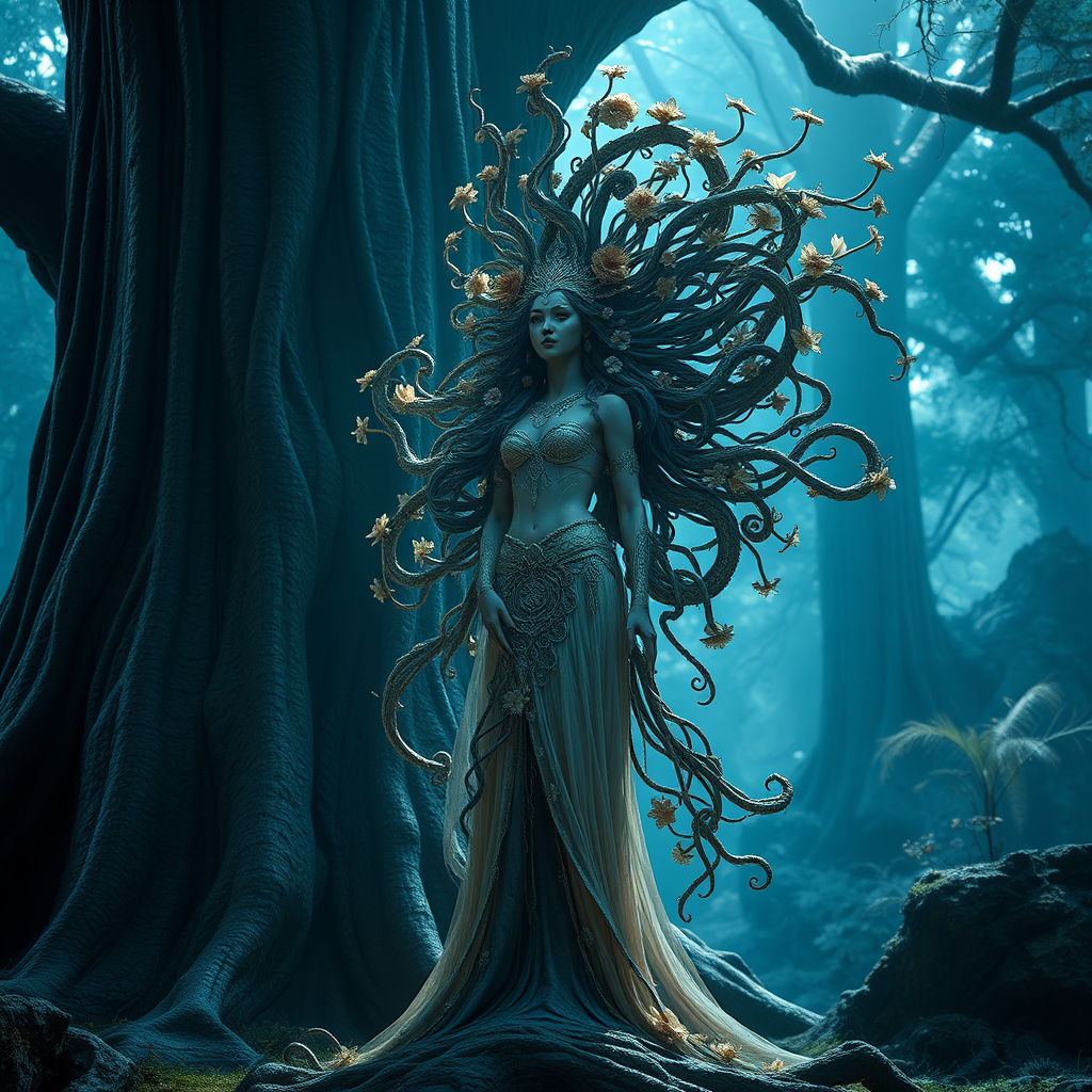 A hyper-maximalist, intricately detailed cinematic forest deity emerges, adorned with floral motifs and flowing, elaborate hair that intertwines with the essence of Magic the Gathering. She stands in a majestic pose, surrounded by the towering grandeur of an ancient tree, embodying the wisdom and history of nature. The scene is crafted with the finesse of MountainDog Studios and rendered with the precision of Unreal Engine, featuring dramatic lighting and deep shadows that highlight her ethereal presence. Orthodox symbolism weaves through the composition, infusing the deity with a spiritual resonance. The atmosphere is ambient, exuding realism and conveying deep emotional undertones, captured in breathtaking 8k resolution, with a 2:3 aspect ratio that enhances the overarching epic narrative.