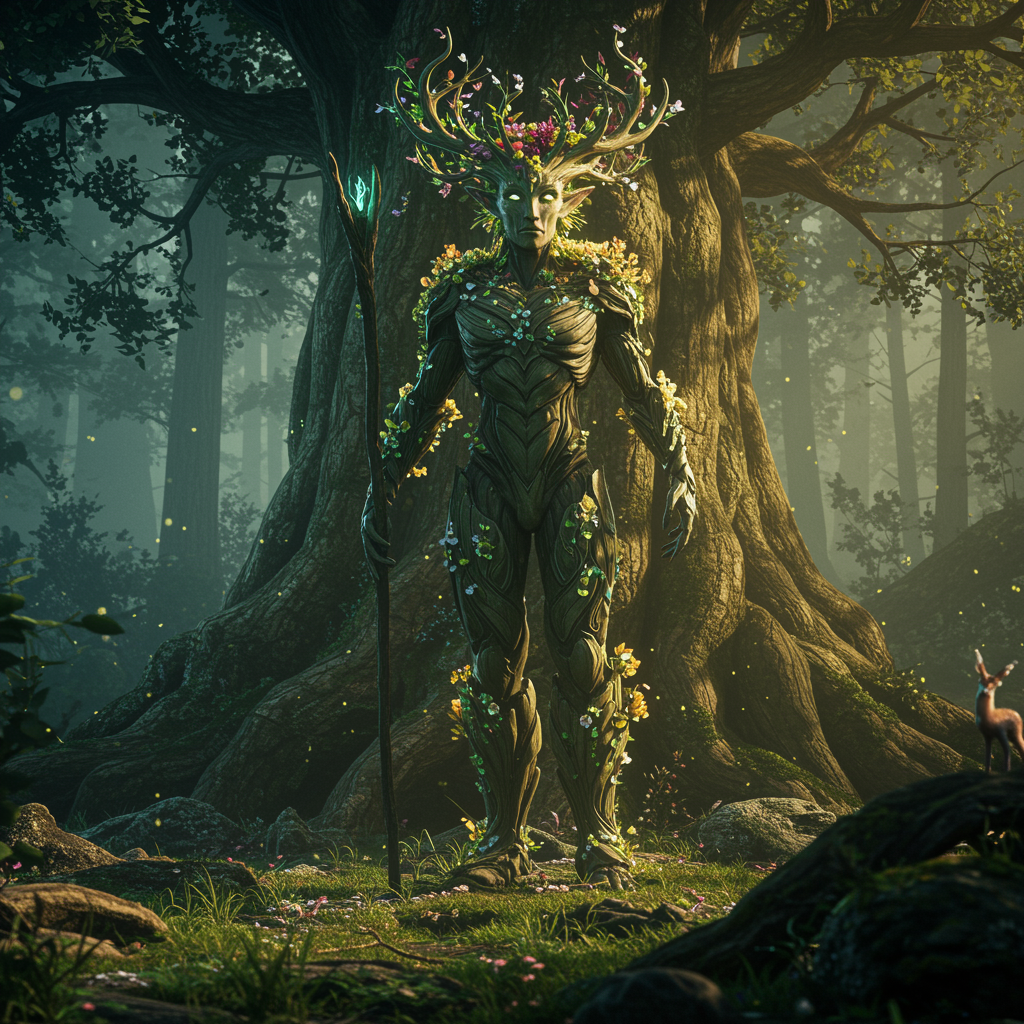 A hyper-maximalist overdetailed cinematic forest deity with intricate floral patterns woven into its flowing hair, exuding the mystique of a Magic the Gathering creature. It stands majestically against the backdrop of a colossal, ancient tree, striking a breathtaking pose. Crafted by MountainDog Studios, the scene is brought to life with Unreal Engine’s intense lighting and shadow work, incorporating subtle orthodox symbolism for a touch of spiritual depth. The atmosphere is rich with ambient light and occlusion, delivering an emotionally resonant and realistic portrayal. Captured in stunning 8k resolution, the scene invites viewers to explore every exquisite detail within its 2:3 aspect ratio. Through small creative tweaks, additional ethereal elements like soft bioluminescent glows and mystical forest creatures peeking through the foliage add layers to the scene’s intricate tapestry, enhancing the otherworldly ambiance.