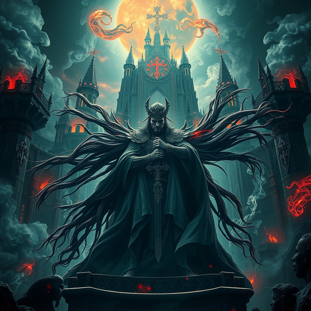 A hyper-maximalist vision unfolds with an intricately detailed, cinematic display of royal darkness. Long, wind-tossed hair and flowing cloth cascade around a commanding figure in the heart of a colossal ancient castle, where magic pervades the air with clouds of toxic fumes and spirals of ghostly smoke. Inspired by the art of Massimo Caggese, this vibrant tableau features dynamic contrast and ominous intricacies, revealing a scene fused with the moebius touch. This visual marvel emerges as if conceived on ArtStation and rendered through Unreal Engine, showcasing dramatic lighting and shadows that highlight orthodox symbolism entwined with tribal dark fantasy. The composition whispers of magic realism, suffused with ambient occlusion and volumetric lighting, creating an emotional tapestry captured in stunning 8k resolution.