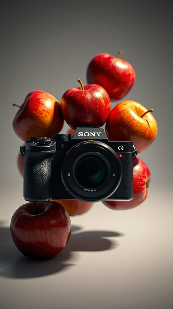 A hyper-realistic 3D render of a conceptual still life featuring a Sony digital camera surrounded by vibrant chromatic apples in mid-air. The scene is characterized by sharp, dramatic lighting that highlights the intricate details of both the camera and the apples, giving a sense of dynamism and tension. The close-up perspective showcases the realism and texture, rendered with Unreal Engine and Octane Render to achieve a photorealistic quality. This digital art piece, suitable for trending on ArtStation, is designed in 8k resolution, capturing the beauty and craftsmanship in breathtaking detail, with a focus on concept art and lifelike precision.