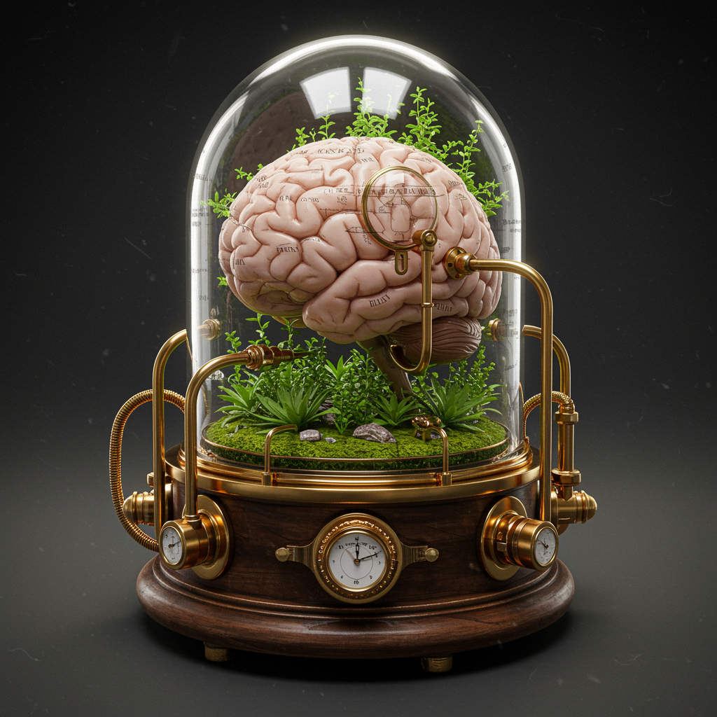 A hyper-realistic 3D render of a futuristic baroque-inspired concept displaying an anatomically accurate brain device intertwined with a lush terrarium. Steampunk elements intricately weave through the design, showcasing an elaborate network of gears, brass tubing, and clockwork. The brain is encapsulated within a transparent dome infused with verdant plant life, creating a harmonious fusion between organic and mechanical. Fine details highlight the device's scientific sophistication, with delicate etchings and patterns adorning its surface, exuding a sense of otherworldly elegance and precision.