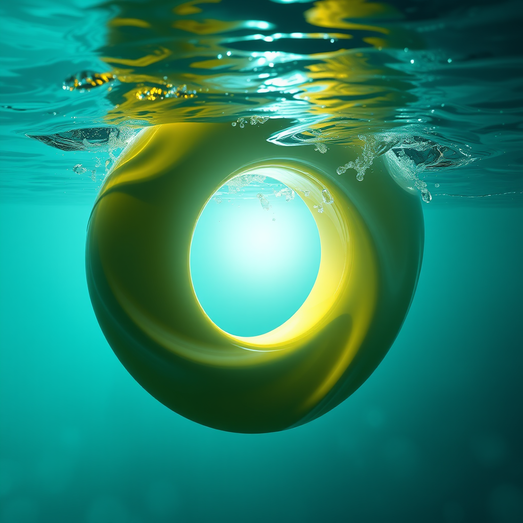 A hyper-realistic 3D render of a letter submerged underwater, featuring a blend of periwinkle and canary yellow hues. Swirling water currents create movement around the form, as bright light emanates from its center, casting high-contrast shadows and an eerie atmosphere. The scene captures the rippling water surface with liquid effects and hyper-detailed textures. Dramatic lighting enhances the mystical environment, offering an 8K resolution view, maintaining a vertical aspect ratio for an immersive experience.