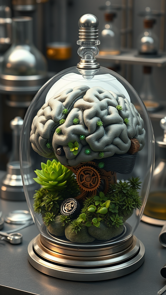 A hyper-realistic 3D render of a sci-fi baroque concept featuring an anatomically correct brain device encased within a glass terrarium. The design incorporates intricate steampunk elements with mechanical gears and ornate details that weave seamlessly into its structure. The device is set against a backdrop of scientific instruments, highlighting its complexity and innovation. Lush greenery and miniature ecosystems thrive within the terrarium, creating a harmonious blend of organic and mechanical. The photorealistic rendering captures the exquisite craftsmanship and detailed textures, with subtle modifications that introduce unique metallic hues and luminescent accents, enriching the overall visual experience.
