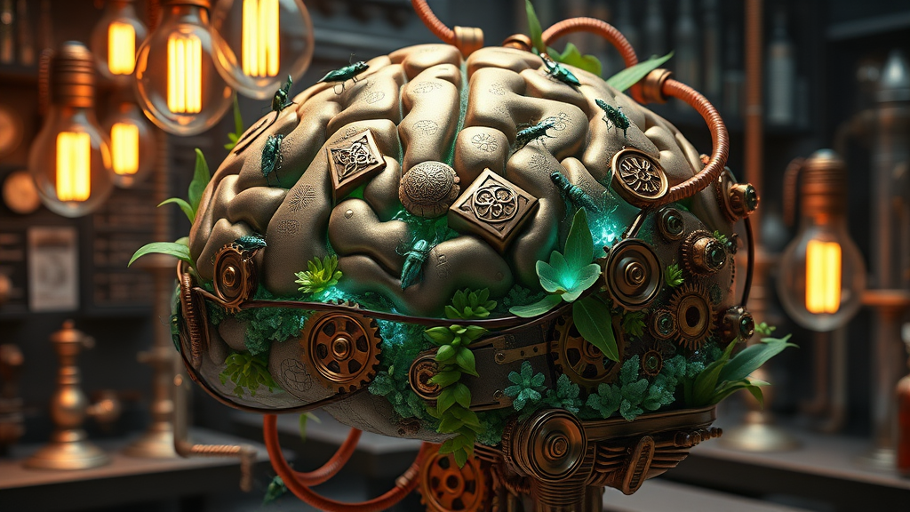 A hyper-realistic 3D render showcasing a sci-fi baroque brain device intricately designed with an anatomically correct structure, seamlessly integrated with a lush terrarium filled with exotic miniature plants and bioluminescent elements. The design combines steampunk aesthetics, featuring ornate brass gears and elegant copper piping that wind around the device, adorned with tiny mechanical insects. The surface is covered with intricate engravings and complex scientific symbols that suggest advanced technology. The device is set within a lab environment, with flickering Edison bulbs casting a warm glow, highlighting the hyper-detailed textures and creating an atmosphere that blends scientific exploration with an artistic touch.