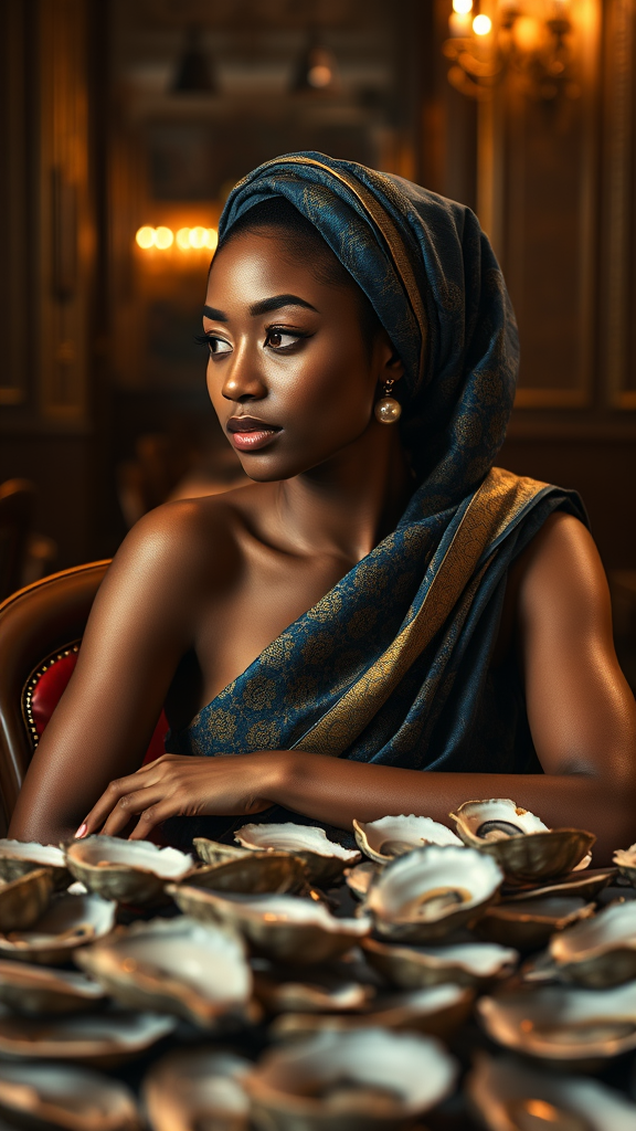 A hyper-realistic, 4k cinematic photograph captures Sei-Gwpe seated elegantly at a table laden with freshly shucked oysters. Bathed in dramatic, cinematic lighting, her pose is both regal and serene. She wears a lustrous pearl earring that catches the light, paired with a richly textured blue and gold headscarf that drapes gracefully around her shoulders. The scene is captured through the sharp eye of a 50mm lens, bringing every detail to life with stunning clarity and vivid colors, creating an atmosphere of opulence and sophistication.