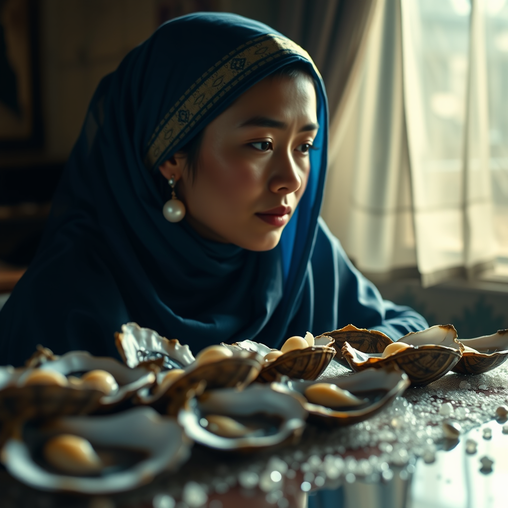 A hyper-realistic 4k photograph of a sei-gwpe seated at a table adorned with freshly shucked oysters, captured with cinematic lighting and a 50mm lens. The sei-gwpe, wearing a blue and gold headscarf, sports an elegant pearl earring that catches the light, adding a touch of sophistication. The scene is enriched with subtle reflections of light on the table surface, highlighting the textures of the oysters' shells and the sheen of the pearls, creating a harmonious blend of color and detail.