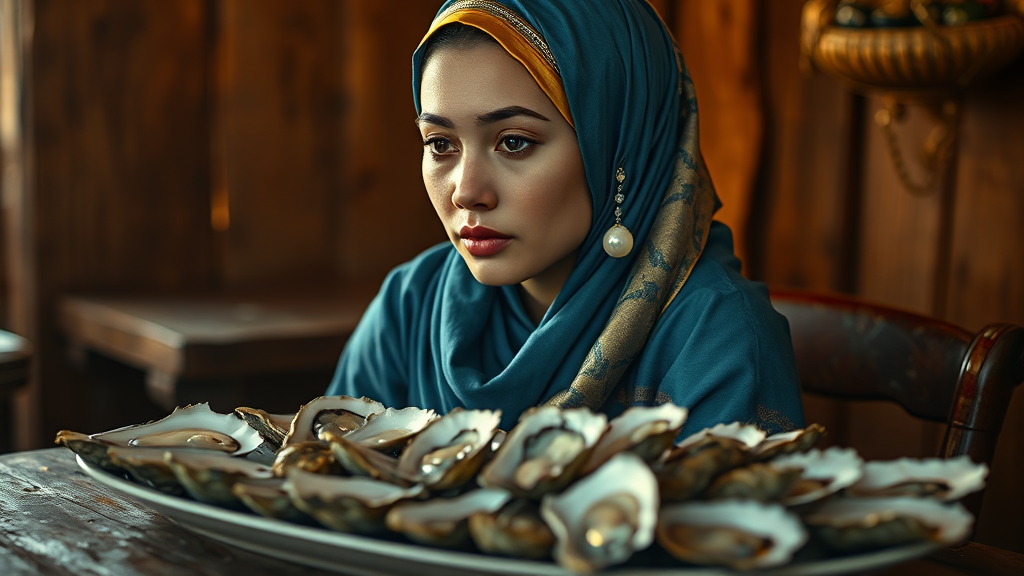 A hyper-realistic 4k photograph of Sei-Gwpe seated at a rustic wooden table adorned with an array of freshly shucked oysters glistening under cinematic lighting. She exudes elegance, wearing a pearl-studded earring that catches the warm glow of the environment. Her blue and gold silk headscarf is artistically draped, adding a touch of regal sophistication. The scene is captured with a 50mm lens, emphasizing the intricate textures of the oysters and the soft, contemplative expression on Sei-Gwpe's face, as hints of sea breeze and ocean mist subtly enhance the atmosphere.