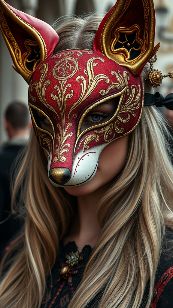 A hyper-realistic 4k portrait captures a mysterious woman at the Venetian Carnival, with flowing blond hair cascading down, intricately detailed, wearing an elaborately designed fox mask that features shimmering gold and crimson patterns. The oil painting technique brings out rich textures and a vibrant play of shadows and light across her serene expression, highlighting delicate features and the sumptuous fabrics of her ornately adorned costume, all set against a softly blurred background that hints at the lively ambiance of the carnival.