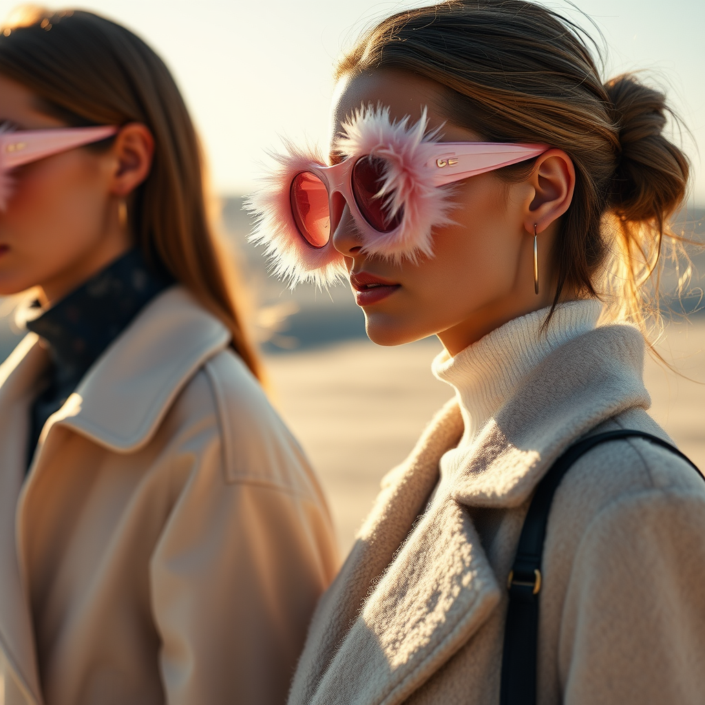 A hyper-realistic 8k fashion shoot featuring a Jacquemus and Moncler collaboration, showcasing models adorned with light pink translucent fur sunglasses in a captivating outdoor setting. The scene captures the essence of luxury and avant-garde design, with the sun casting gentle glows and soft shadows, highlighting the intricate details and textures of the sunglasses. Models are styled in elegantly layered outfits that blend natural tones and pastel colors, seamlessly merging the sophistication of Jacquemus with the innovative spirit of Moncler. The overall atmosphere exudes a sense of modern elegance intertwined with playful creativity.