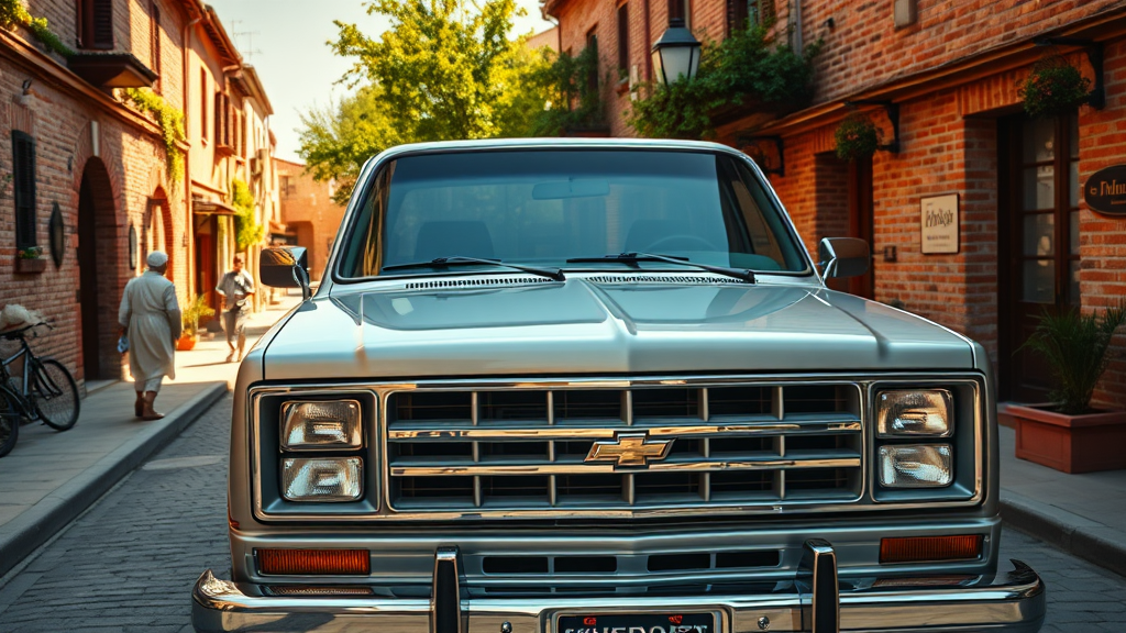 A hyper-realistic 8K image of a vintage Silver 1987 Chevrolet Blazer K5 parked in a quaint village under the bright midday sun. The vehicle's polished exterior reflects the vibrant color palette of the surroundings, with rustic brick buildings and lush green trees lining the narrow cobblestone streets. A few curious villagers in casual attire can be seen in the background, adding a lively yet serene atmosphere. The view captures a slight upward angle, emphasizing the Blazer's robust design and iconic details, with sun dappled patterns cast across its hood, creating a perfect balance between classic charm and cinematic allure.