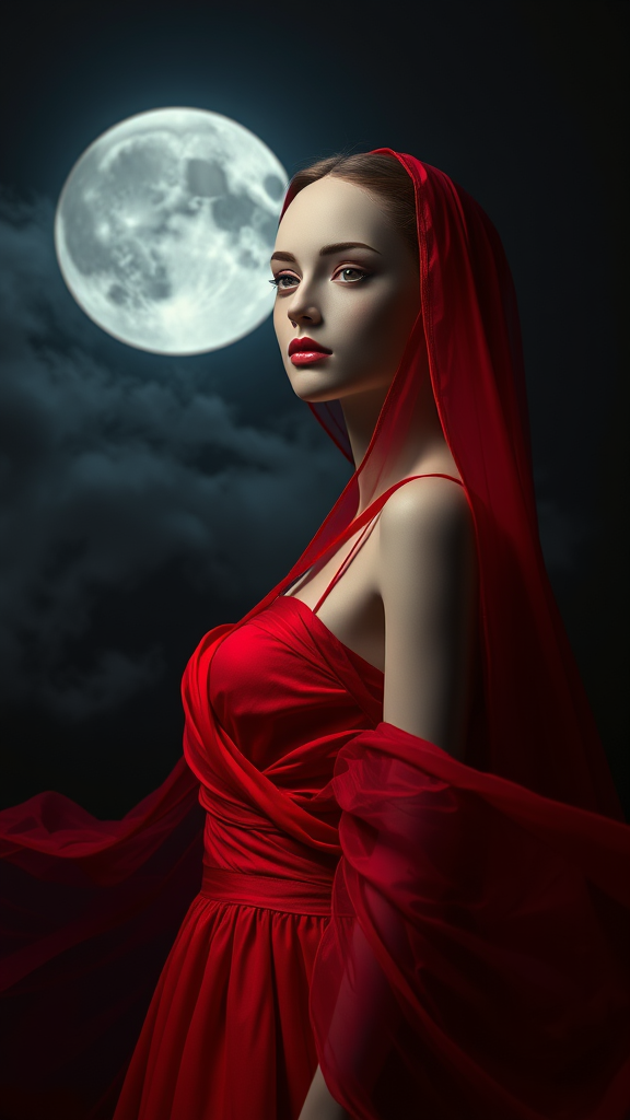 A hyper realistic 8k portrait of a mannequin in a flowing scarlet red gown, set against a captivating full moon night. The scene is drenched in an enchanting darkness, with the moon casting a silver glow on the elegant fabric. Intricate details are highlighted, from the delicate features of the mannequin's face to the subtle textures of the dress. Soft shadows add depth, while the ethereal ambiance of the moonlit night enhances the surreal beauty of the composition. Wisps of cloud partially cover the moon, adding a layer of mystery to the imagery.