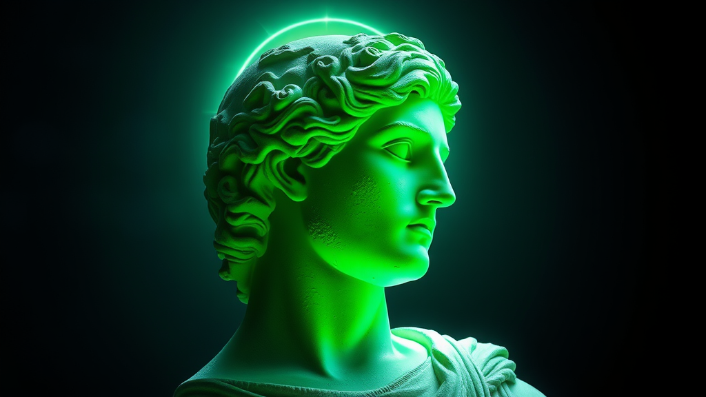 A hyper-realistic ancient Greek statue with the head in profile, enveloped by a radiant halo of light, featuring a vivid neon green color palette, showcasing ultra-detailed textures and intricate elements, set against a contrasting shadowy background that highlights its ethereal presence.