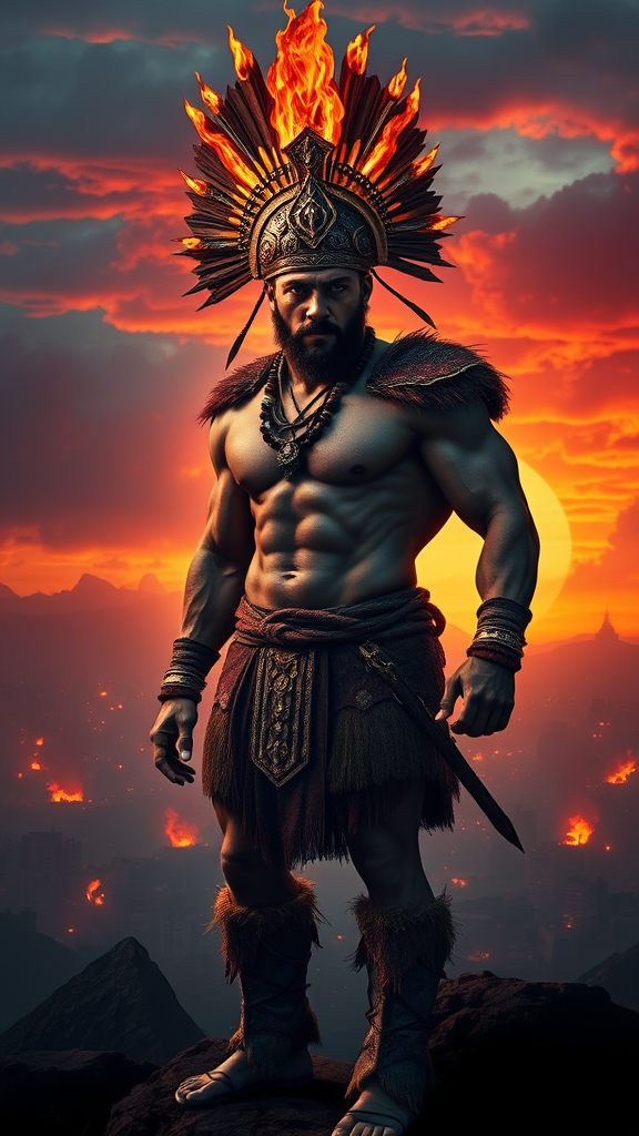 A hyper realistic and highly detailed full body depiction of a savage-looking muscular male, exuding a sense of brutal strength, set against the dramatic backdrop of a burning city as the sun sets. The scene is illuminated with warm, vibrant colors that complement the fiery oranges, reds, and deep turquoise hues of the sky. This ancient era warrior stands as the main element, wearing an epic and majestic headdress that is engulfed in flames, intricately crafted from mysterious elements, resonating with the exotic theme. His head, face, torso, arms, hands, legs, and feet are rendered in exquisite detail, each feature telling a story of resilience and power. The atmosphere radiates with a dark, aesthetically pleasing aura, using colors that echo the dramatic beauty of a sunset. The man is around 35 years old, embodying the essence of a time long past, yet vividly brought to life through extremely vibrant colors and imaginative creativity.