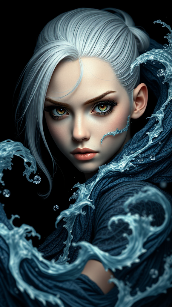 A hyper-realistic and intricate rendering of One Punch Man's Tornado character depicted against a stark black background, her intense gaze fixed on the viewer. She is enveloped in a mesmerizing marine scene that swirls with the fluidity and mystique of ocean currents, integrating elements of dolly kei and dragoncore aesthetics. Her figure is realistic and finely detailed, with textures that capture both the softness of fabric and the subtle sheen of scales. The close-up composition highlights her expressive features, blending elements of fantasy with lifelike precision, creating a captivating and otherworldly visual experience with an aspect ratio of 4:7.