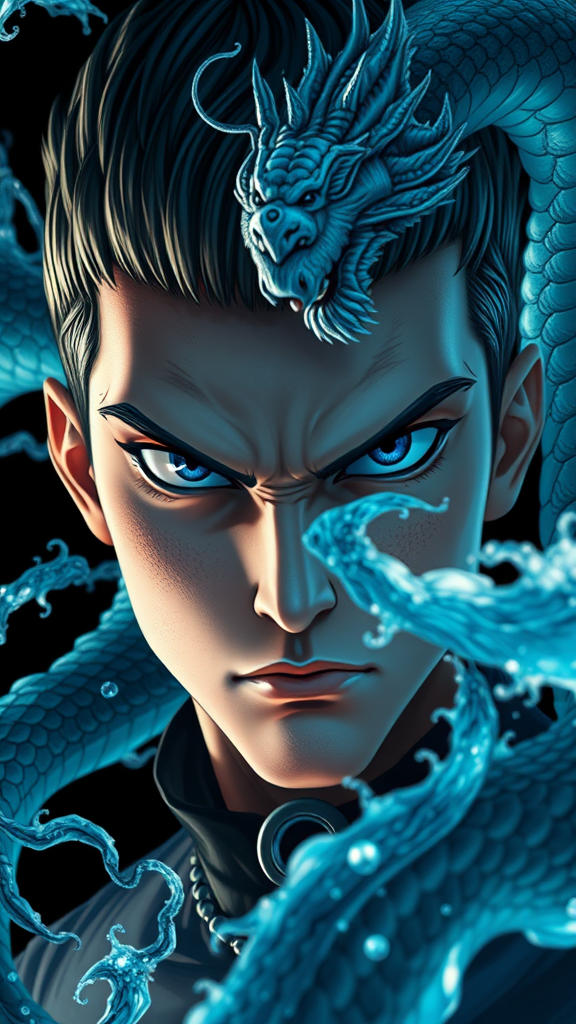 A hyper-realistic and intricately detailed rendering of One Punch Man's Tornado, gazing intently at the viewer against a deep black background. The scene incorporates mesmerizing marine elements, blending the ethereal beauty of the ocean with Tornado's powerful aura. The style draws inspiration from dolly kei and dragoncore, featuring realistic figures adorned with fantastical dragon motifs and whimsical, vintage-inspired attire. The close-up composition highlights the expressive intensity of the scene, capturing a fusion of strength and surreal beauty in an elongated 4:7 aspect ratio.