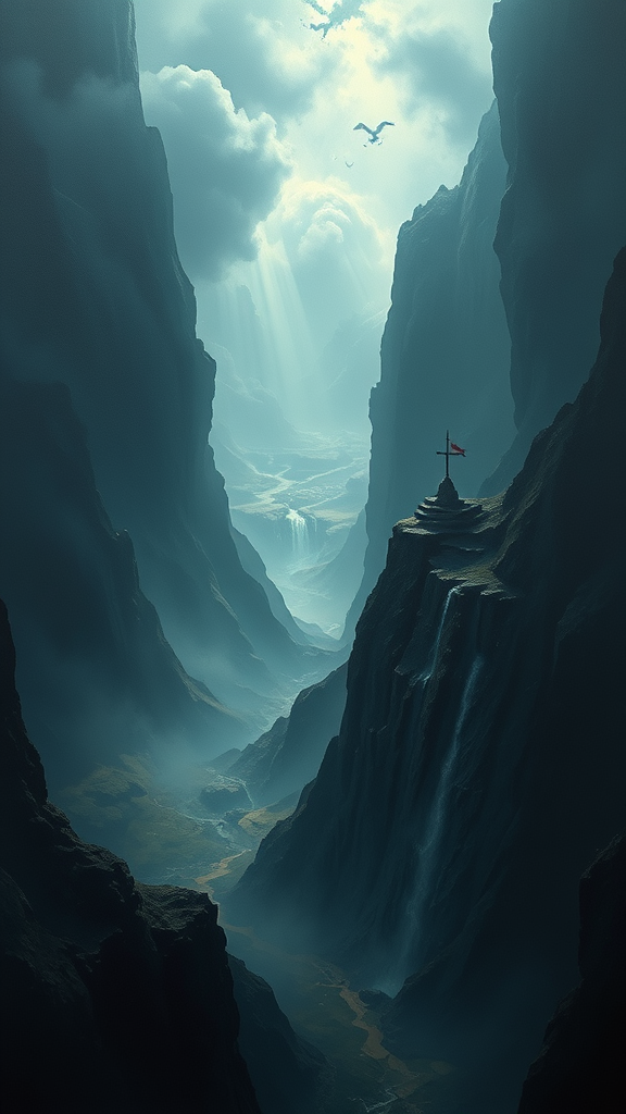 A hyper-realistic and mysterious painting depicting an epic landscape, where soft lights gently illuminate the scene, casting delicate shadows and highlighting the intricate details. The atmosphere draws the viewer into an enigmatic world that feels both tangible and fantastical, capturing a moment that blends reality with imagination, inviting endless curiosity and wonder.