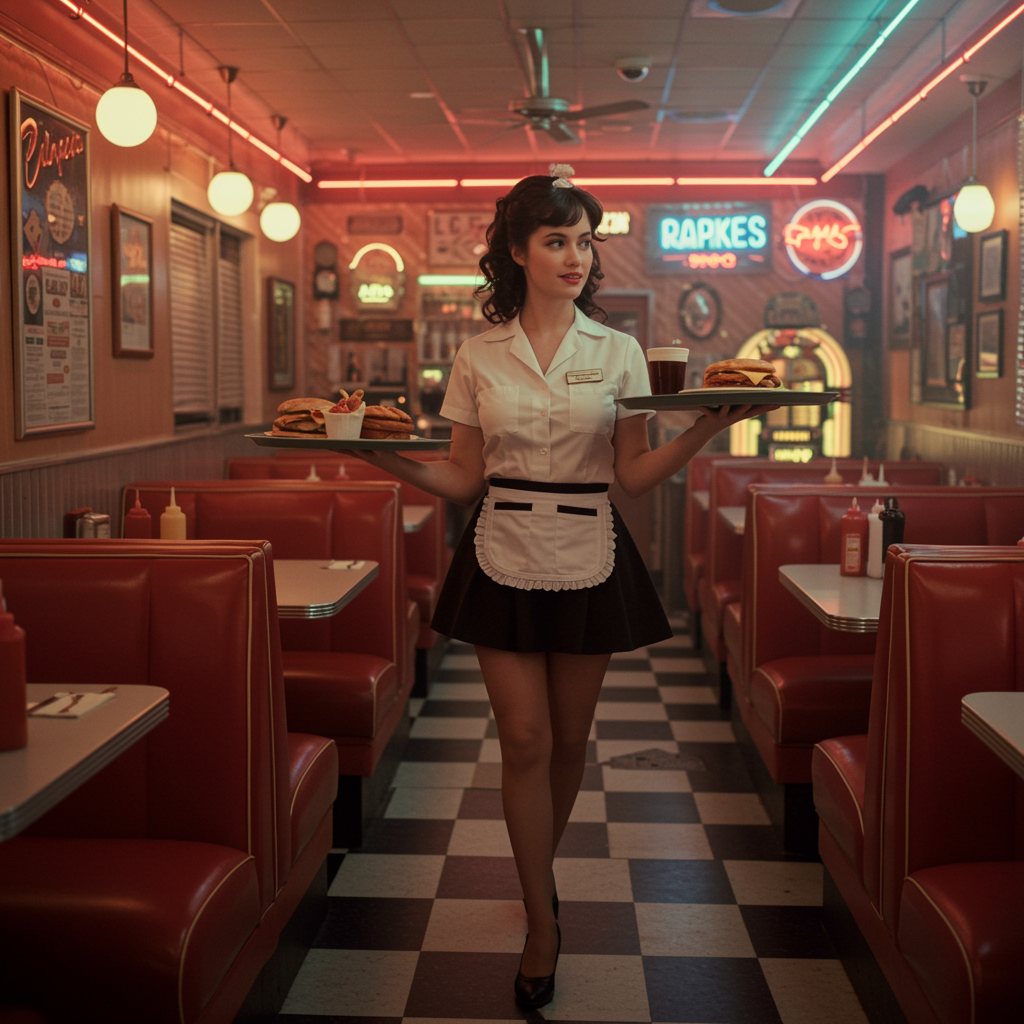 A hyper-realistic and photo-realistic image capturing a waitress in a vibrant 1980s-style diner, showcasing a bustling atmosphere with retro décor and neon lights. She is elegantly balancing a tray of classic diner fare, with an expression of friendly professionalism. Captured in high resolution, the scene has a studio photoshoot quality, with sharp details and a delicate depth of field that draws attention to the diner's authentic details, such as the checkered floor, red vinyl booths, and jukebox in the background. The waitress is dressed in period-appropriate attire, evoking nostalgia while exuding warmth and charm.