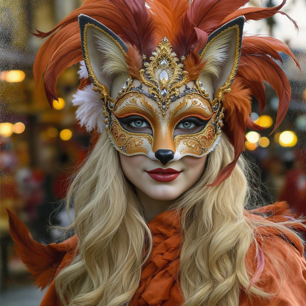 A hyper-realistic and ultra-detailed 4k portrait of a woman at a Venetian carnival, with striking blonde hair cascading beneath an intricately designed fox mask adorned with delicate gilded patterns and vibrant feathers. Her eyes, expressive and captivating, peek through the mesmerizing mask as if telling a story of mystery and allure. The oil painting technique adds depth and richness, capturing the interplay of light and shadow on her flawless skin. The background features the blurred, colorful lights of the carnival, enhancing her enigmatic presence. The scene blends a touch of whimsy with the timeless elegance of Venetian artistry.