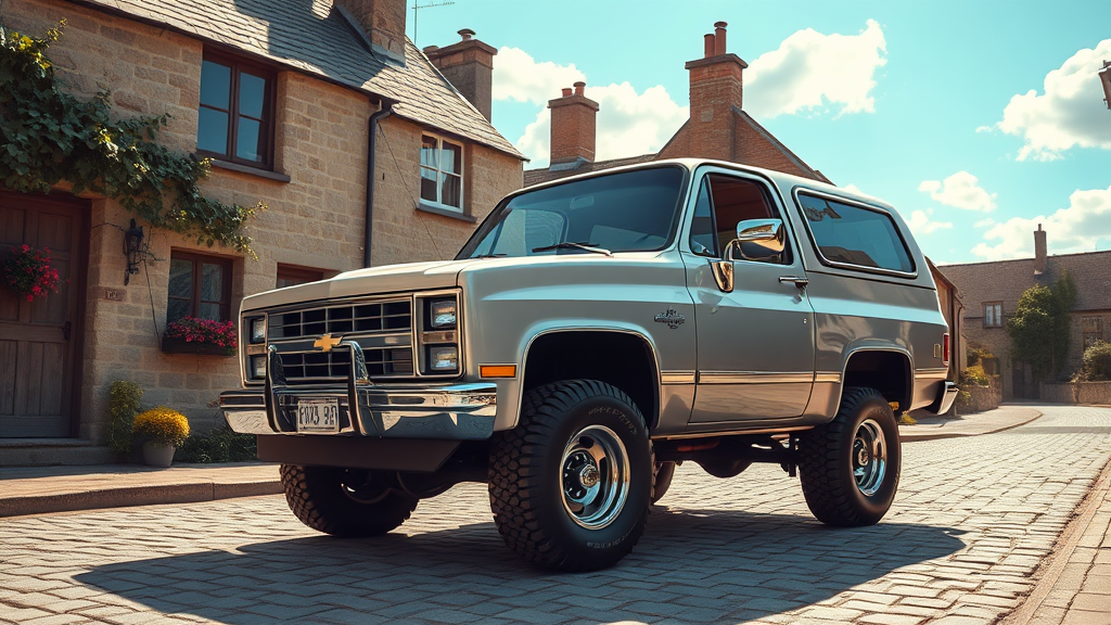 A hyper-realistic and ultra-detailed portrayal of a classic silver 1987 Chevrolet Blazer K5 parked on a sunlit cobbled street in a quaint village at midday, with cinematic 8K clarity. The backdrop features charming stone cottages with climbing ivy and vibrant flower boxes, while fluffy clouds dot the bright blue sky, casting soft shadows. The sunlight gleams off the polished chrome details of the Blazer, accentuating its vintage curves and rugged stance.