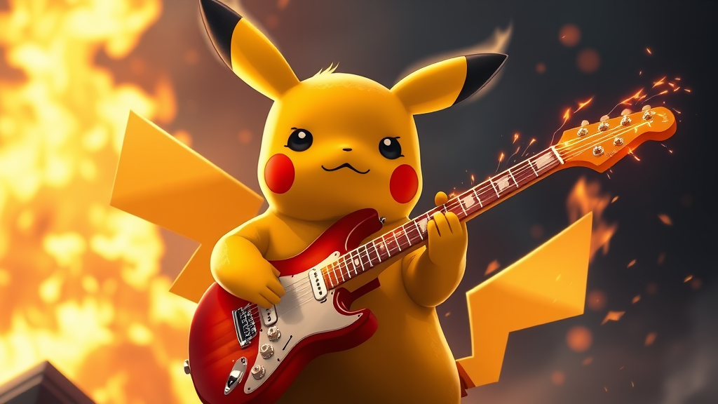 A hyper-realistic anime-style Pikachu with flames dancing around it, strumming a glowing electric guitar with sparks flying from the strings, while its fur is illuminated by the fiery backdrop.