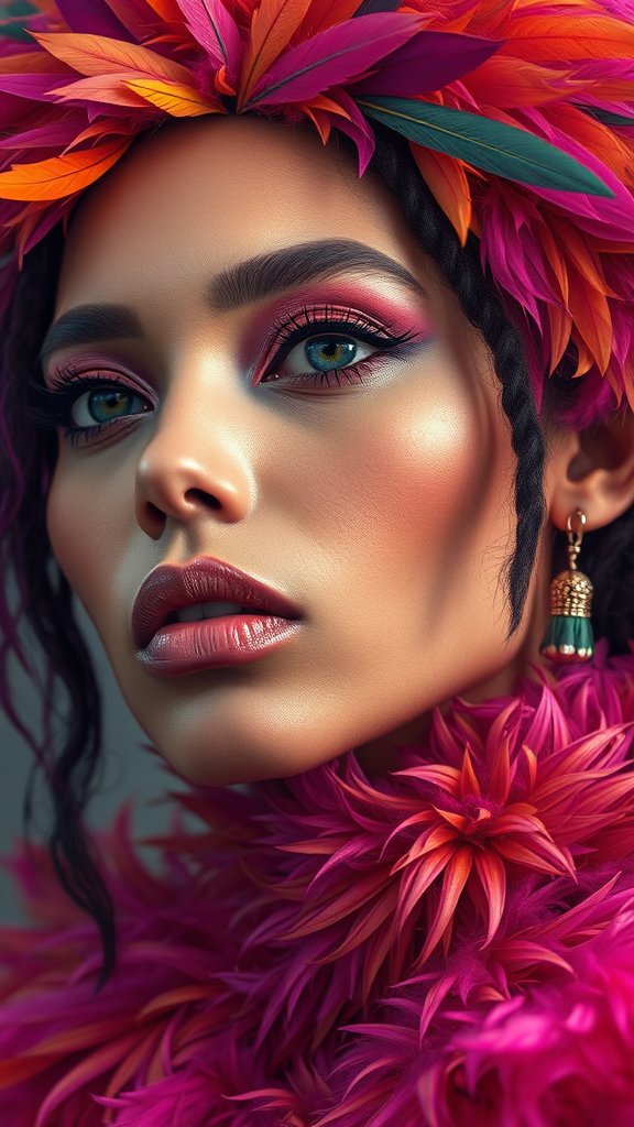 A hyper-realistic baroque portrait of Zoë Kravitz crafted entirely from vibrantly colored feathers, featuring incredibly intricate details and textures, capturing her likeness with stunning precision and layered complexity, in the distinctive style reminiscent of Tom Bagshaw, enhanced with subtle creative touches for a unique masterpiece.