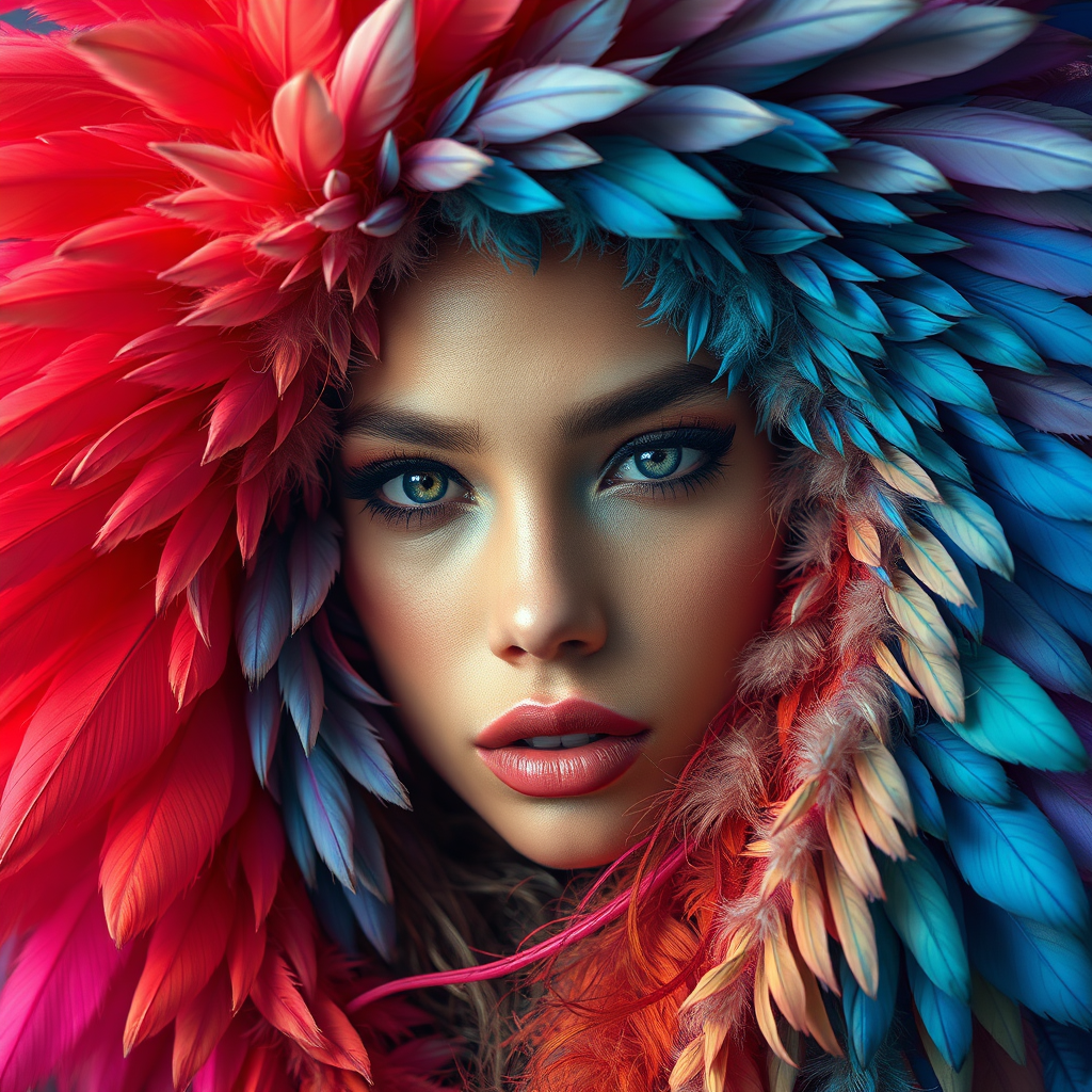 A hyper-realistic baroque portrait of Zoë Kravitz crafted entirely from an array of vivid feathers, showcasing intricate detail and masterful artistry, rendered in the style of Tom Bagshaw, highlighting a mesmerizing blend of elegance and surreal imagination with subtle creative elements to enhance the concept.