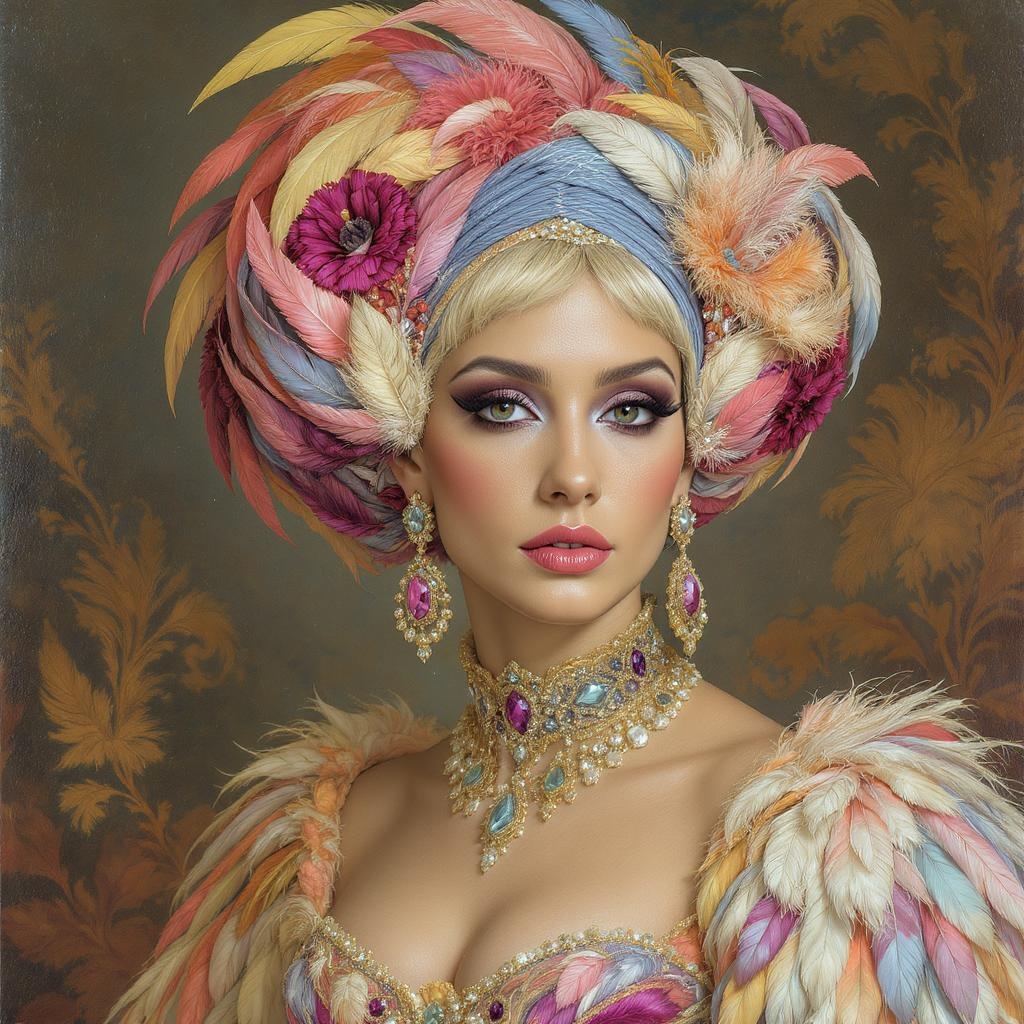 A hyper-realistic baroque portrait of Zoë Kravitz crafted entirely from an array of meticulously arranged feathers, showcasing intricate detail and vibrant colors, capturing her essence with a touch of ethereal elegance; inspired by the artistic style of Tom Bagshaw, this masterpiece exudes a harmonious blend of realism and surrealism, highlighting delicate textures and captivating expressions.