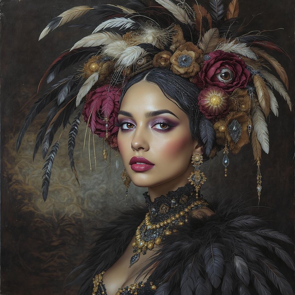 A hyper-realistic baroque portrait of Zoë Kravitz crafted entirely from intricately arranged feathers, capturing her essence with exceptional detail, infused with the artistic style of Tom Bagshaw, and embodying an incredible masterpiece of exquisite complexity and beauty.