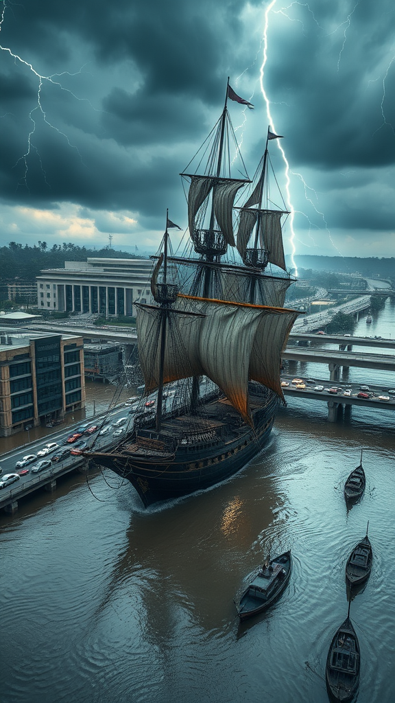 A hyper-realistic bird’s-eye view of a massive 16th-century pirate ship stranded amidst a flooded highway in Makassar, Indonesia. The ancient ship, with its towering sails tattered and worn, displays faded wood and weathered paint from centuries of exposure. Surrounding the ship, floodwaters have submerged the streets, while elevated flyovers are packed with stationary cars trapped in a rain-induced traffic jam. In the background, the imposing University of Makassar campus looms, and nearby, several Pinisi ships and small boats drift aimlessly in the swelling waters. The atmosphere is charged with drama and chaos, as dark storm clouds gather, and frequent lightning bolts streak across the sky, illuminating the scene. A torrential downpour creates a misty fog enveloping the city, with rain-induced ripples on the floodwaters casting eerie reflections of the surreal tableau. The juxtaposition of the ancient pirate vessel, the modern urban environment brought to a standstill, and the timeless Pinisi ships creates a cinematic and otherworldly effect. The ferocious storm, overwhelming flood, and historical ship marooned amidst contemporary life convey the formidable power of nature and an unexpected convergence of eras.
