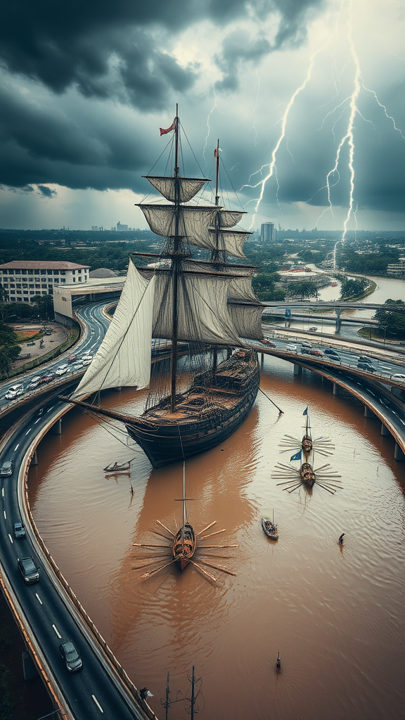 A hyper-realistic bird’s-eye view reveals a 16th-century pirate ship marooned in the midst of a flooded highway in Makassar, Indonesia. The ship, venerable and timeworn, displays soaring sails that hang in tatters, its timber and paint bleached and battered by the elements. Encircling the vessel, muddy floodwaters engulf the streets, with elevated flyovers crammed with vehicles halted by a traffic jam, victim to the relentless downpour. In the backdrop looms the University of Makassar, its campus structure unyielding against the tempest, while nearby, traditional Pinisi ships and smaller crafts drift aimlessly, surrendered to the encroaching floods. The mood is both dramatic and chaotic; dark, menacing clouds loom above, sporadically shattered by lightning that reveals the tumultuous scene. The torrential rain descends in sheets, conjuring a spectral haze that envelopes the city, while a myriad of raindrops disturbs the water’s surface, forming ghostly reflections of the unfolding drama. The juxtaposition of the aged pirate vessel amid a bustling modern city ensnared by traffic, alongside the floating Pinisi ships, crafts a dreamlike and cinematic tableau. This tempestuous weather, coupled with the overpowering deluge and the historical ship adrift in a contemporary milieu, underscores a powerful expression of nature’s dominion and the uncanny collision of time and place.