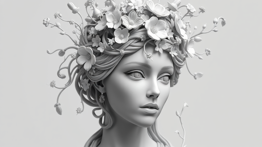 A hyper-realistic black and white sculpture of a woman featuring an intricate, nature-inspired crown adorned with futuristic elements, vines, and delicate floral motifs, showcasing a blend of organic and sci-fi aesthetics, crafted with meticulous detail reminiscent of a ZBrush creation.