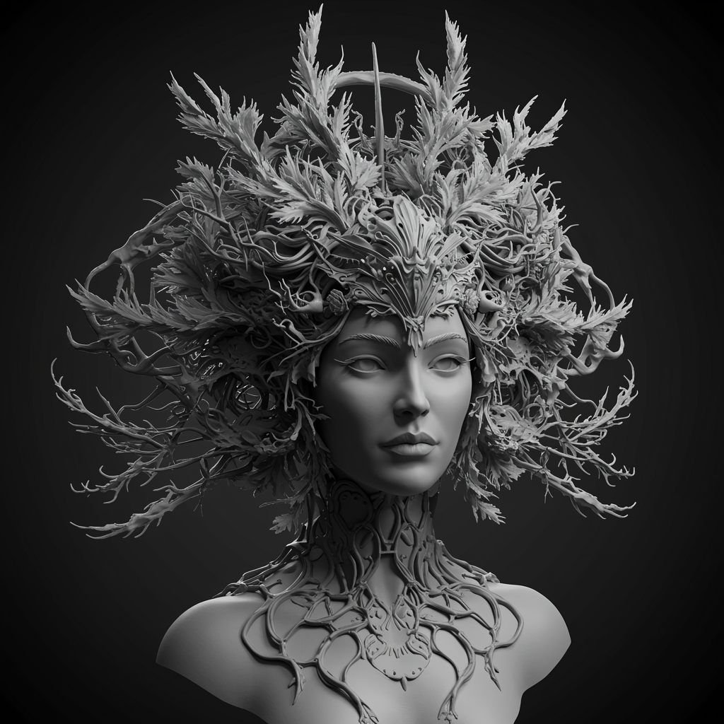 A hyper-realistic black and white sculpture of a woman featuring an intricate, futuristic crown intertwined with delicate, detailed depictions of nature such as vines and leaves; the piece is rendered with ZBrush detailing, blending organic and sci-fi elements seamlessly, capturing a fusion of elegance and otherworldly mystery.