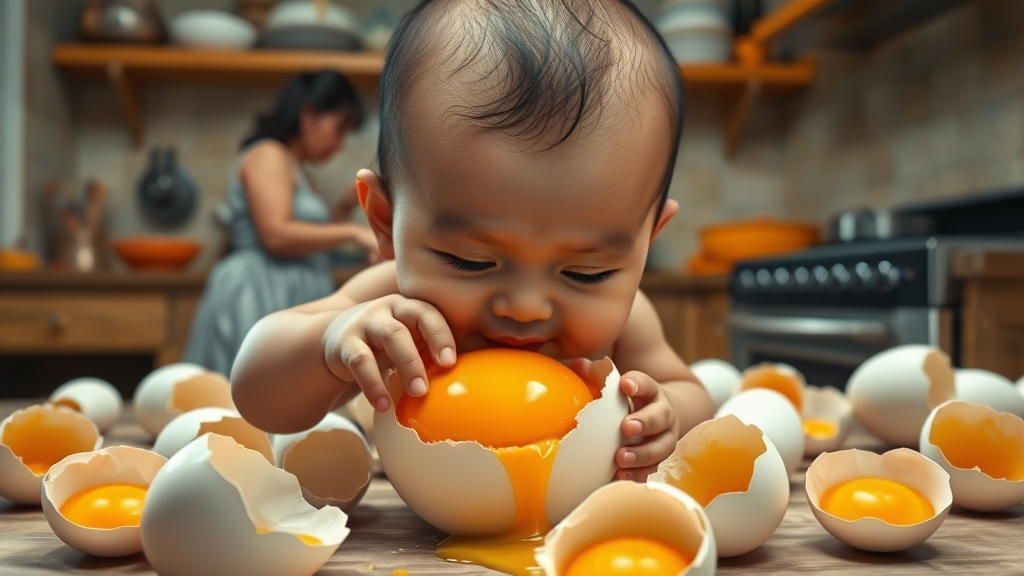 A hyper-realistic caricature of a large-headed baby featuring the face of an Indonesian adult man, grasping the edge of a freshly hatched egg, surrounded by rich, golden yolk. In the backdrop, several identical broken eggs scatter across a bustling kitchen, where a woman can be seen cooking at a stove. The scene is captured in exquisite detail, highlighting the contrast between the surreal baby and the normal kitchen environment, rendered in Ultra HD, 5k resolution.