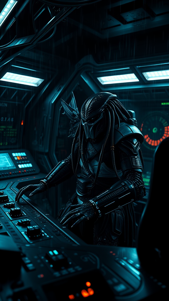 A hyper-realistic cinematic depiction of a Predator from the movie "Alien vs. Predator," portrayed as a futuristic hologram at a complex control panel, set aboard a dimly lit, wet, and shadowy spaceship. The scene is rich with intricate and hidden details, captured with high dynamic range and a keen attention to realism. The environment is moisture-laden, with highlights and reflections on the glossy surfaces, immersing the viewer in a dark, captivating atmosphere. Avoid distractions such as artist signatures, watermarks, usernames, or visible errors, ensuring the focus remains on the stunning and detailed portrayal of this iconic extraterrestrial warrior in a sophisticated, technologically advanced setting.
