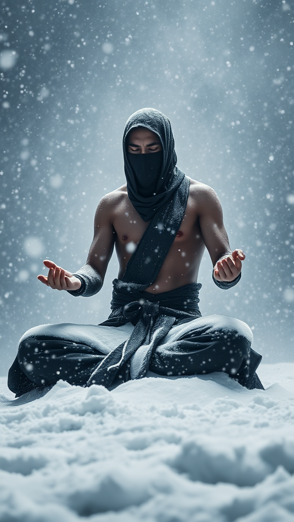 A hyper-realistic, cinematic image depicts a solitary ninja in deep meditation amidst a ferocious blizzard. His traditional Japanese fundoshi barely conceals his body, leaving his skin exposed to the biting cold. Snow layers partially cover his shoulders, arms, and legs, a testament to his unwavering stillness and focus. Despite the relentless snowfall and cutting winds, the ninja sits cross-legged, hands resting on his knees, exuding tranquility. His eyes are closed, showcasing a profound meditative state, unperturbed by the chilling conditions. The swirling blizzard contrasts sharply with the ninja's serene demeanor as snow and ice dance violently in the air. His breath, almost imperceptible, underscores his spiritual discipline amidst the chaos. Volumetric light beams pierce through the storm, casting gentle, ethereal glows on the ninja and the snow-draped ground. These beams interact with the flitting snowflakes, creating a mesmerizing shimmer, enhancing the surreal, dreamlike quality of the scene. While the blizzard seems distant, its chaotic energy is overshadowed by the meditating ninja's stillness. The scene's color palette leans heavily on cold tones—pale blues, whites, and icy grays—highlighting the harshness and solitude of the environment. The ninja's minimal attire in traditional fundoshi, coupled with his serene posture, suggests a transcendence beyond the physical realm, as he appears to become one with the surrounding elements. In a subtle twist, the only hint of warmth is a faint, golden hue on the horizon, suggesting the first light of dawn breaking through the storm, symbolizing hope and inner strength amidst adversity.