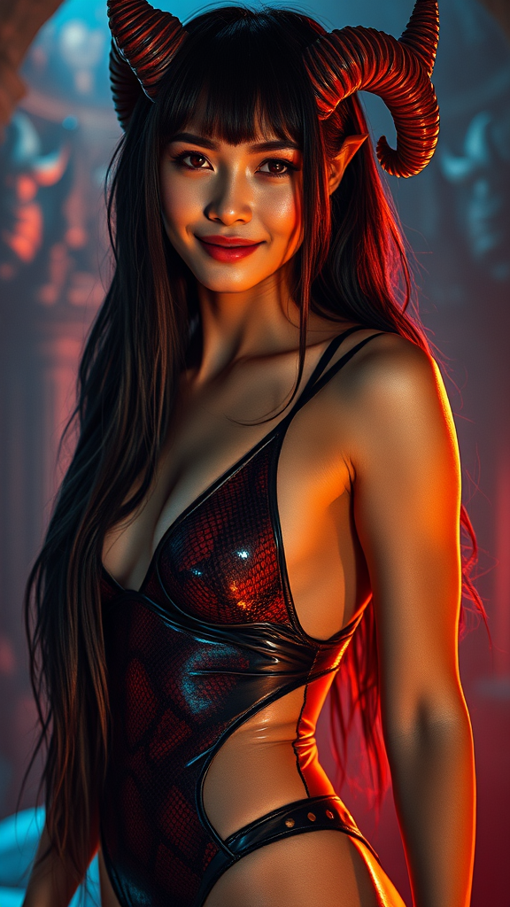 A hyper-realistic, cinematic image portrays a female demon character, embodying the dark, mystical essence akin to the works of Zdzisław Beksiński, H. R. Giger, and Ashley Wood. The photograph, inspired by the warm, golden tones of a Kodak Ektar lens, is accented by subtle lens flares. She wears a shiny black latex swimsuit with a snakeskin pattern that highlights her toned and athletic physique. Her long, black hair cascades like a waterfall of night, sharply contrasted by choppy bangs that frame her heart-shaped face. Majestic, curved horns emerge from her forehead, adding to her otherworldly allure. A milky white slime subtly trickles from the corners of her smiling mouth, adding a chilling yet fascinating detail. The ambient blue and red lighting creates an ethereal glow, as if transcendent beings have graced a sacred temple. Her slender hand, adorned with a red snakeskin pattern, elegantly works the strings of a burning violin, where hellfire dances across its dark wooden body. The scene captures a mesmerizing blend of beauty and darkness, drawing the viewer into its enigmatic atmosphere.