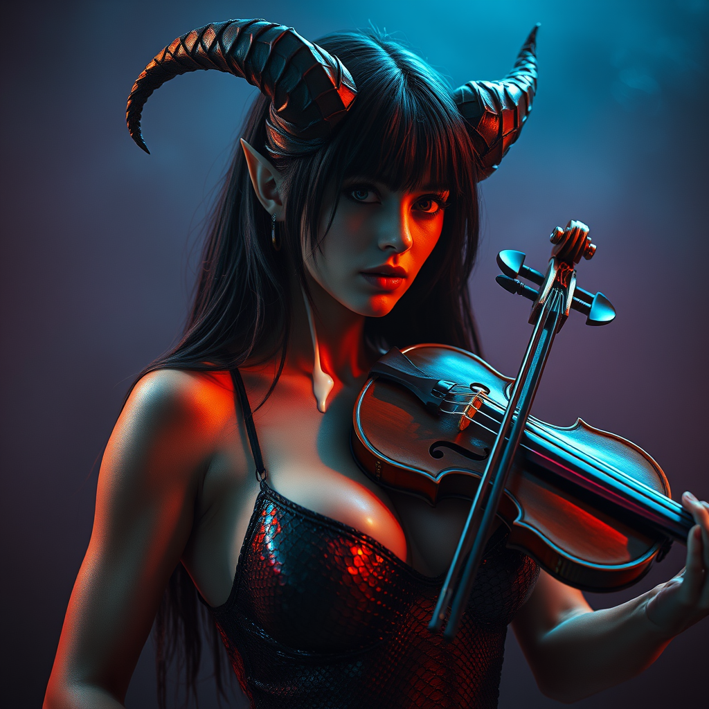 A hyper-realistic, cinematic photo captures a female demon character, channeling the dark, mystical essence of artists like Zdzisław Beksiński, H. R. Giger, and Ashley Wood. The aesthetic is infused with the warmth and richness of Kodak Ektar lens-inspired tones, featuring soft, golden highlights and occasional lens flare. She wears an intricate, shiny black snakeskin-patterned latex swimsuit that highlights her sculpted, athletic physique. Her long, raven hair cascades down her back, styled with sharp, choppy bangs that frame her heart-shaped face. Large, elegant horns extend subtly from her forehead, complementing the demonic allure. A white milky substance trickles from the corner of her mouth, adding an eerie charm. The atmosphere buzzes with intensity, enveloped in ambient blue and red lighting that casts an ethereal, radiant glow, as though celestial beings have descended on the scene. The charred neck of a violin stands out prominently, its strings manipulated gracefully by her ruby-red, snakeskin-patterned hand, as hellfire flickers across its dark wood. Subtle modifications enrich the essence, maintaining a sense of haunting beauty and mysticism.
