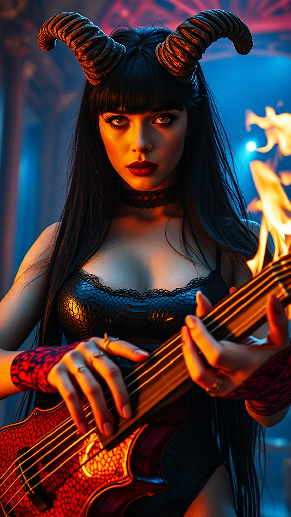 A hyper-realistic, cinematic photo of a female demon character, evoking the dark, mystical styles of Zdzisław Beksiński, H. R. Giger, and Ashley Wood, with an aesthetic influenced by a Kodak Ektar lens, showcasing warm, golden tones and subtle lens flare. She is adorned in a Rawish shiny black snakeskin pattern latex swimsuit that highlights her toned, athletic physique. Her long, black hair cascades down her back like a waterfall of night, with sharp, choppy bangs framing her heart-shaped face. Large, elegant horns curve from her forehead, while a faint stream of milky white slime traces from the corner of her mouth. The scene is charged with ambient blue and red lighting, creating an ethereal, radiant glow as if divinity itself has descended upon the temple. A burning violin neck is prominently displayed, gripped by her red snakeskin-patterned hand, skilfully manipulating the strings as hellfire dances across the dark wood of the instrument. Small creative nuances enhance the core concept, blending mysticism and striking visual elements into a captivating portrait.