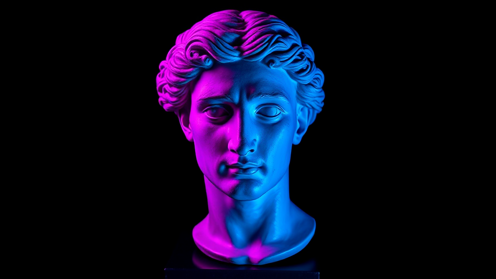 A hyper-realistic classical bust in neon glow with a front view, featuring deep purple and blue hues. Isolated on a stark, dark background, the bust is dramatically lit with strong emphasis on texture and contrast, creating a low-key light environment. The intricate details are rich and vivid, capturing the depth and complexity of the surface. While maintaining the essence of classical art, the piece embraces modernity with its neon accents and deep contrast, offering a fresh yet timeless visual experience. The overall composition maintains a sense of balance and harmony, with subtle creative twists to enhance its ethereal and captivating aesthetic.