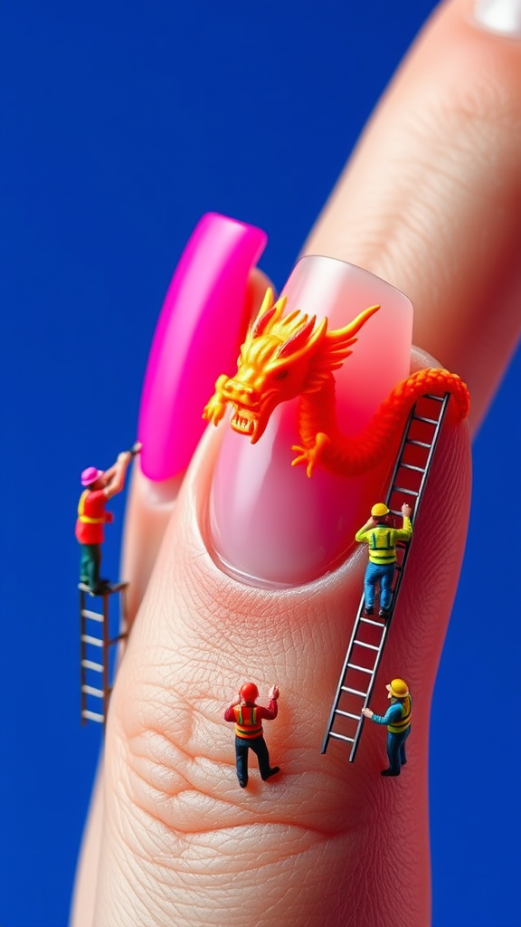 A hyper-realistic close-up of a young woman's fingers showcases her bright, beautiful fingernails, which are extraordinarily detailed and glossy. Tiny, diligent workers in colorful uniforms are intricately painting and sculpting a gradient from ombre pink to fiery orange dragons on the nails, wielding oversized paint brushes and precision tools. Others are polishing the nails with soft cloths, standing on ladders and miniature platforms like expert craftsmen maintaining a monumental structure. Against a background of vivid, electric blue, this whimsical yet realistic scene bursts with energy, featuring cinematic depth of field, ultra-detailed textures, and a playful yet sophisticated aesthetic.
