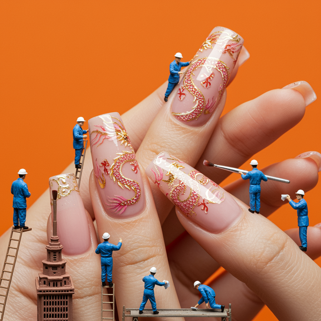 A hyper-realistic close-up of a young woman's fingers showcases her bright, stunning fingernails, which are intricately detailed and glossy. Tiny miniature workers in blue uniforms are diligently painting and illustrating a delicate ombre pink and gold dragon on the nails. They are equipped with oversized paint brushes, while others meticulously polish with soft cloths. These workers are strategically positioned on ladders and small scaffoldings, appearing as if they are performing maintenance on a grand structure. The backdrop is a vivid, bold orange, creating a striking contrast that enhances the scene's surreal yet photorealistic quality. The image is imbued with cinematic depth of field, ultra-detailed textures, and exudes a whimsical yet highly professional aesthetic.