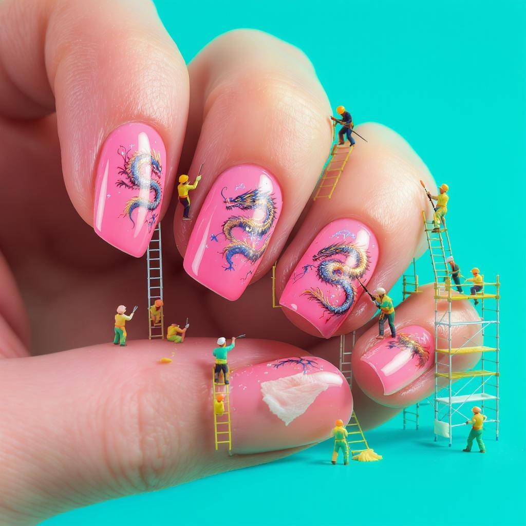 A hyper-realistic close-up of a young woman's fingers showcases her bright, glossy fingernails, each adorned with intricate ombre pink dragons. Tiny miniature workers in colorful uniforms are busily painting the dragons with oversized brushes and adding delicate details using fine tools. Others are carefully polishing the nails with soft cloths, perched on tiny ladders and platforms resembling scaffolding. The background is a vivid turquoise, providing a striking contrast to the scene's detailed focus. This surreal yet lifelike depiction features cinematic depth of field, ultra-detailed textures, and a whimsical yet professional atmosphere, blending fantasy with hyper-realism.