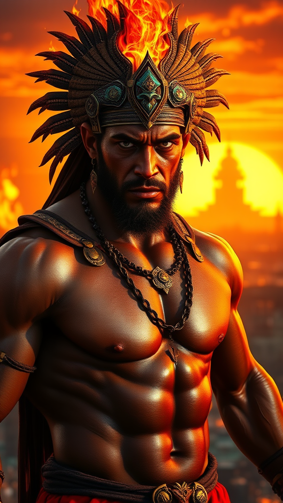 A hyper-realistic depiction of a 35-year-old male with a finely detailed, muscular and robust appearance, set against the backdrop of a burning city at sunset. Dramatic lighting highlights his head, face, torso, arms, and fully extended body, enhancing the savage and dark aesthetic. He stands out as the main element, with vibrant colors complementing the orange and red of the sunset, infused with turquoise hues. The ancient era is evoked by his attire, featuring an epic, majestic headdress that's ablaze, crafted from intricately detailed materials. The scene is enhanced by colors that vividly amplify the warmth of the sunset, creating an extremely vibrant and intense visual.