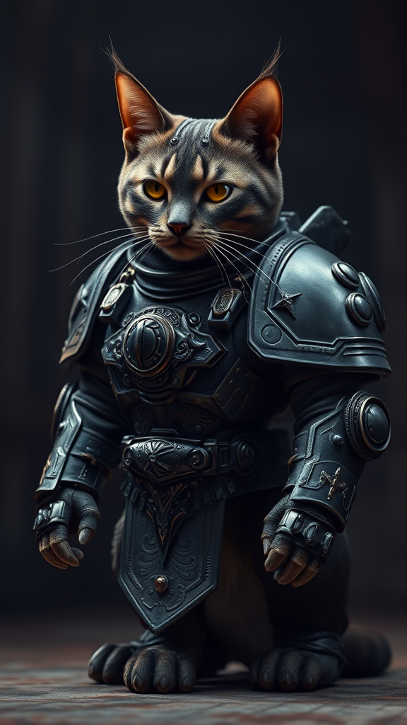 A hyper-realistic depiction of a cat adorned in finely detailed Adeptus Astartes power armor, inspired by Warhammer 40k. The scene is set in dark tones with cinematic lighting highlighting the intricate embellishments of the armor. The cat stands poised in an epic, battle-ready stance, its eyes glinting with an intelligent focus. The armor is adorned with subtle feline motifs and enhanced with small creative embellishments that echo the grace and agility of a warrior cat while maintaining the grandeur and power of the Adeptus Astartes aesthetic.