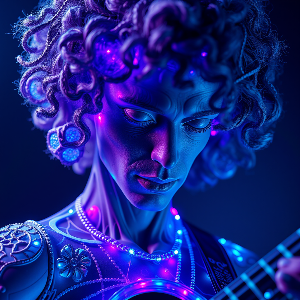 A hyper-realistic depiction of a curly-haired musician, inspired by Beeple, emanating a vibrant true blue glow. The figure is crafted with intricate sculpting, adorned with delicate patterns and networks. Bright gray and electric purple hues intermingle throughout, creating a rich tapestry of colors. The scene captures finely detailed layers and textures, evoking a sense of dynamic rhythm and movement in a 9:16 aspect ratio.